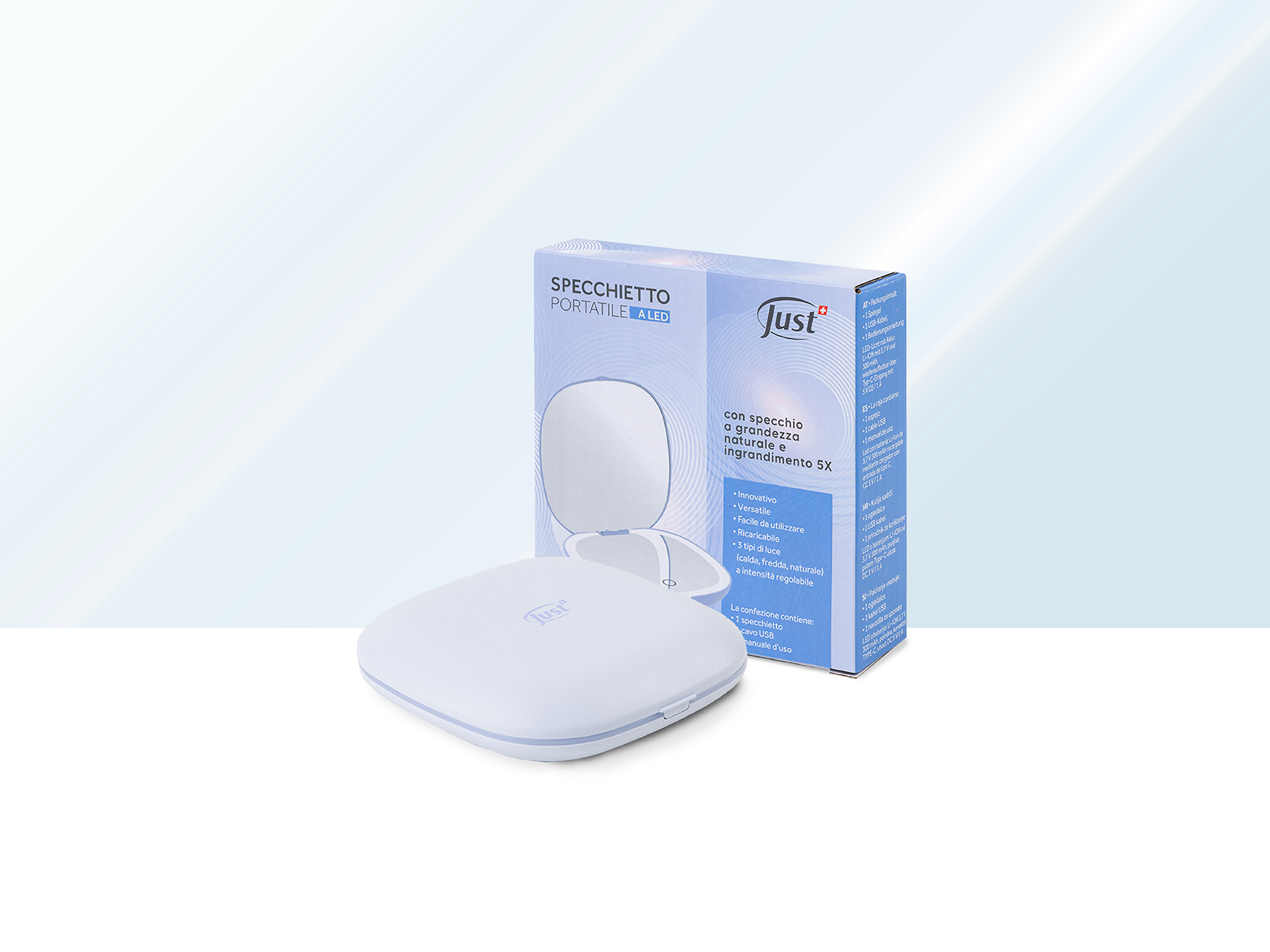 En ambos sets, el espejo portátil con luz LED regulable. Es recargable, tiene 3 tipos de luz y un aumento de 5x. Perfecto para llevar encima en cualquier ocasión, para pequeños retoques cotidianos y de viaje.