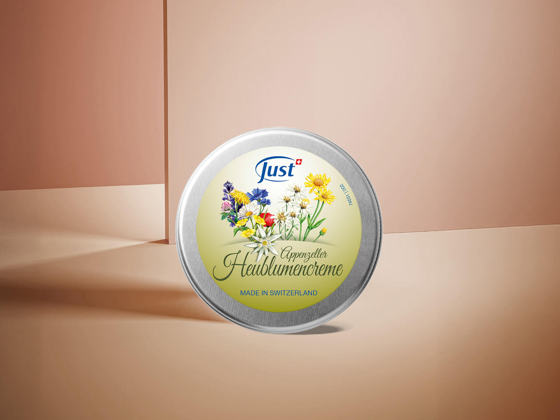 Con emolientes vegetales y extractos de edelweiss cultivada en exclusiva para Just en los Alpes suizos, árnica y flores de heno.