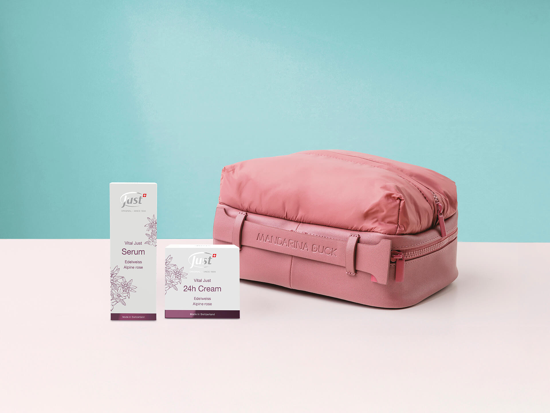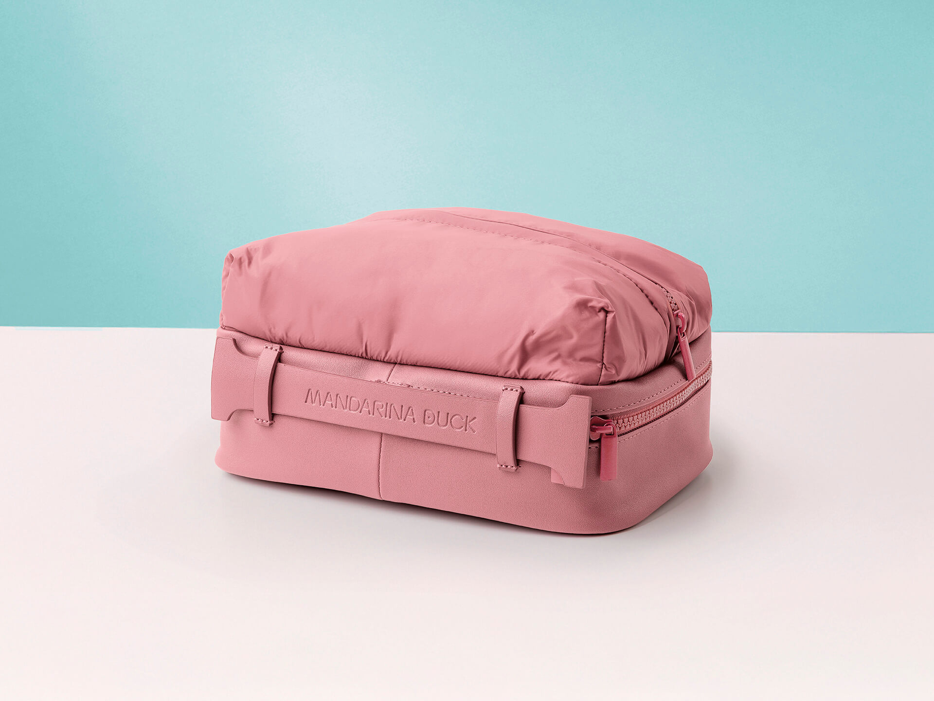Con ambas propuestas, llévate también el neceser Mandarina Duck, un accesorio imprescindible creado en exclusiva para Just. Elegante y espacioso, presenta dos compartimentos separados, uno blando y uno rígido, que permiten dividir mejor las cosas que necesites llevar contigo.